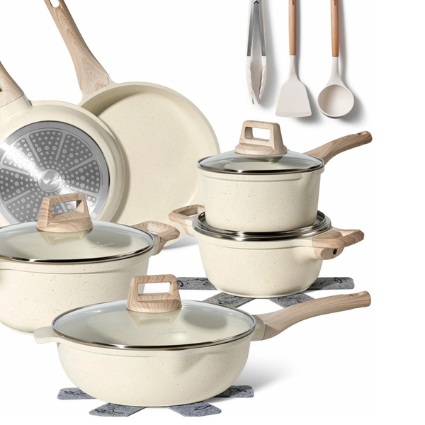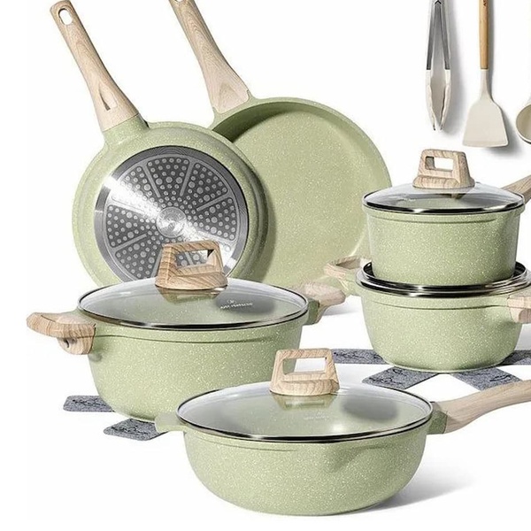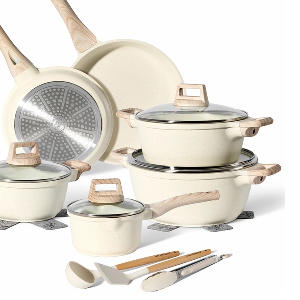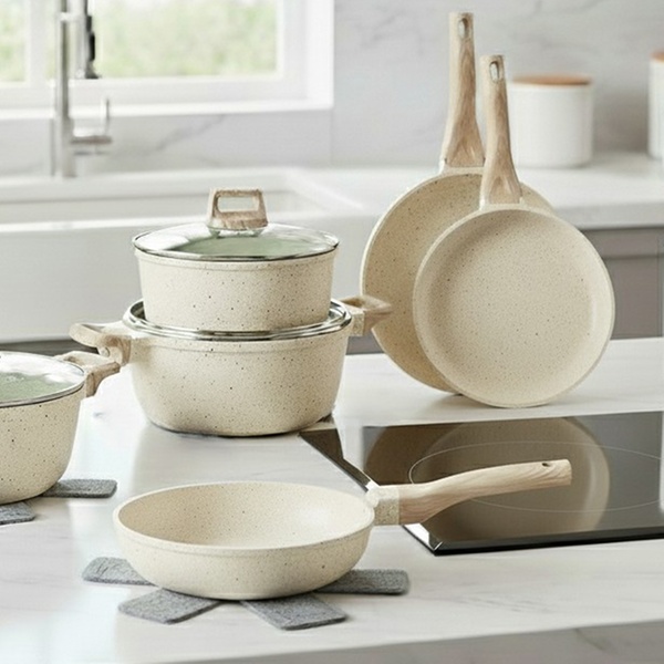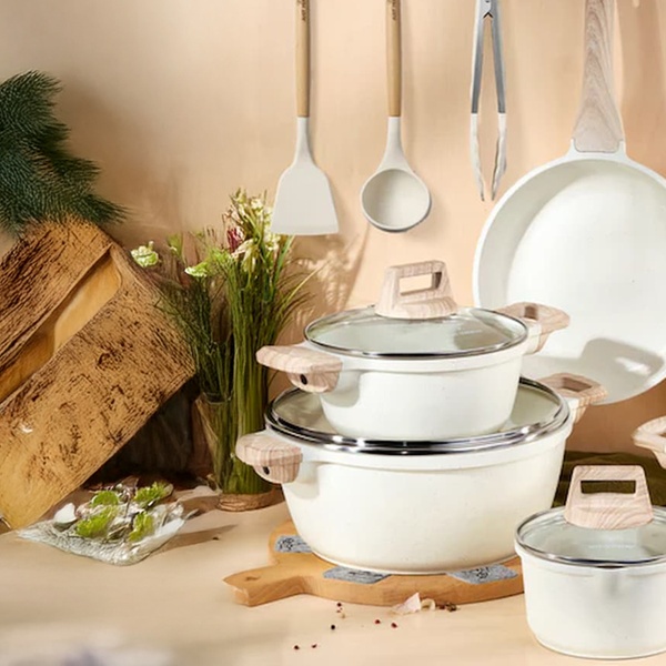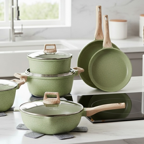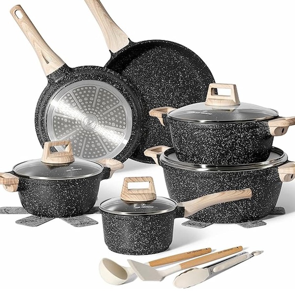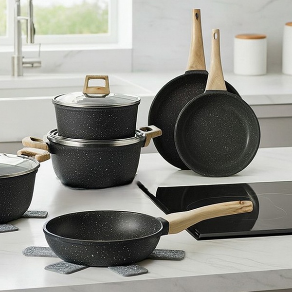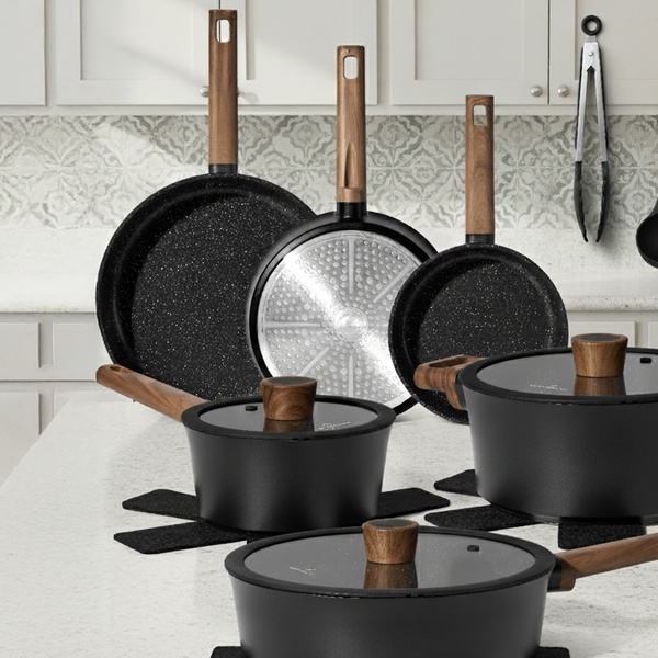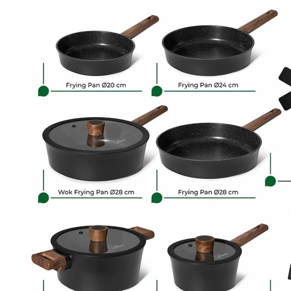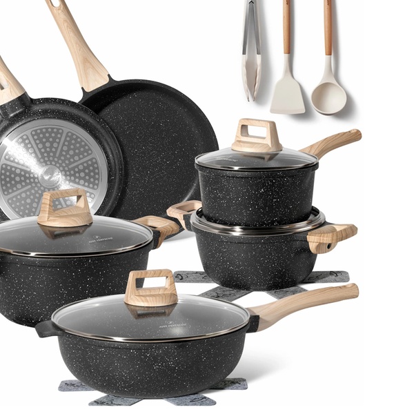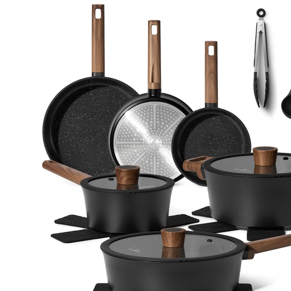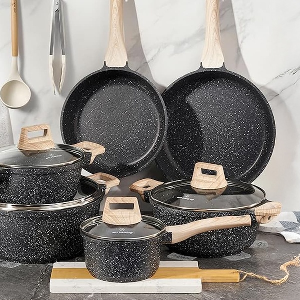 Une batterie de cuisine complète de 15 pièces Just Perfecto avec revêtement antiadhésif en granit/marbre et technologie 5 couches, compatible tous feux dont induction, pour une cuisine saine, facile et un nettoyage rapide. Inclut poêles, casseroles, cocotte, wok et accessoires.