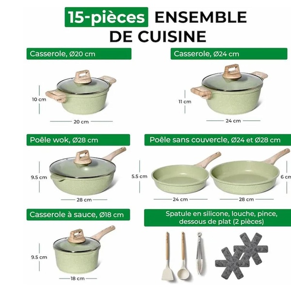 Batterie de cuisine avec 15 pièces antiadhésives