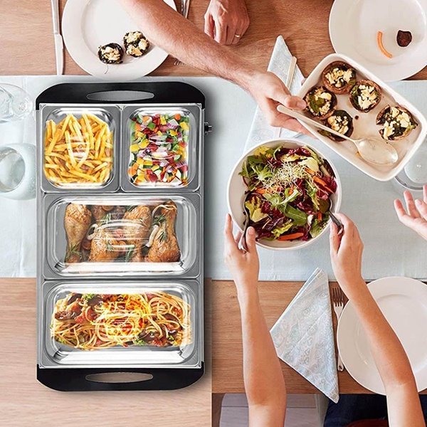 Transformable en grande plaque chauffante, ce buffet garde les aliments à température idéale tout en s'adaptant à tous les repas.