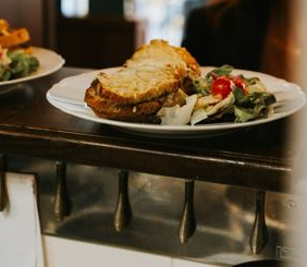 Croque Monsieur : huile d'olive, tomate confite, truffe purée, jambon blanc, fromage comté, mesclun de salade avec oignons frits