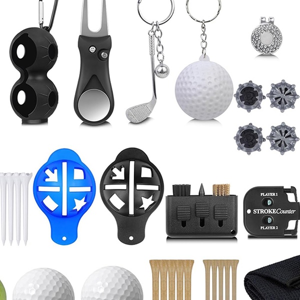 - Accessoires possibles comme marqueurs de balle, tees, outils de réparation de divot, brosses, pinces pour serviettes et gadgets variés