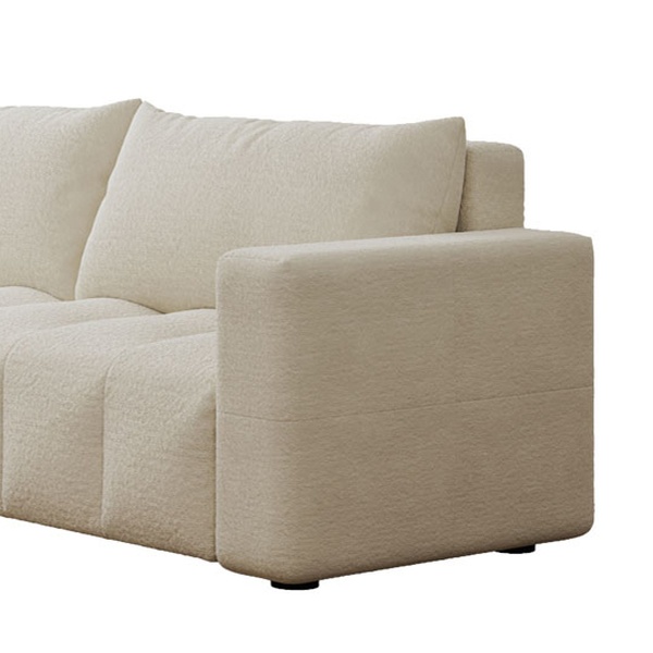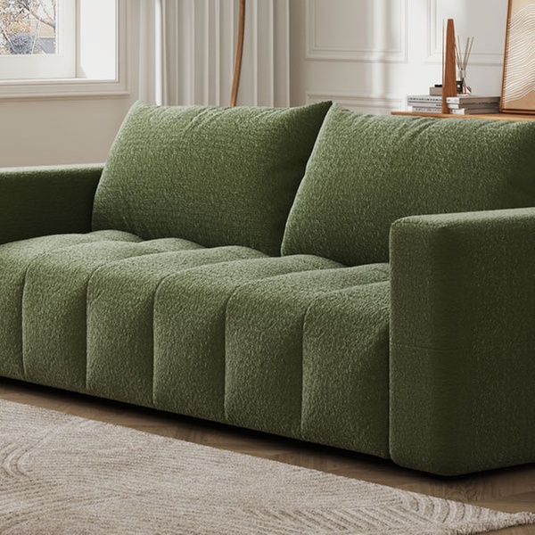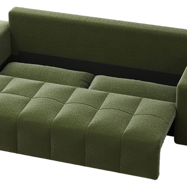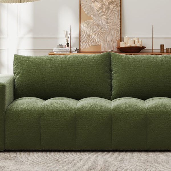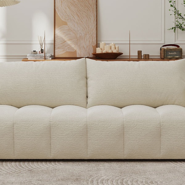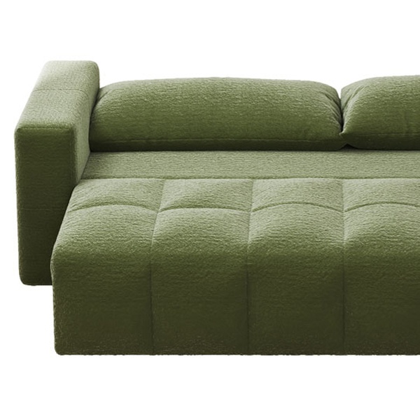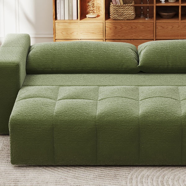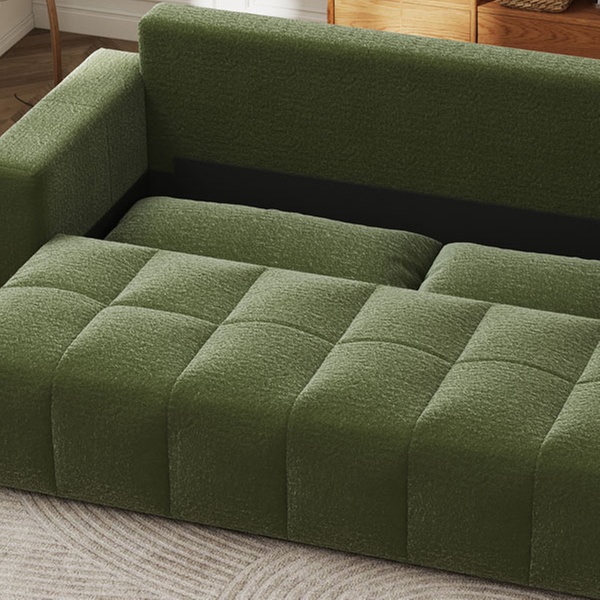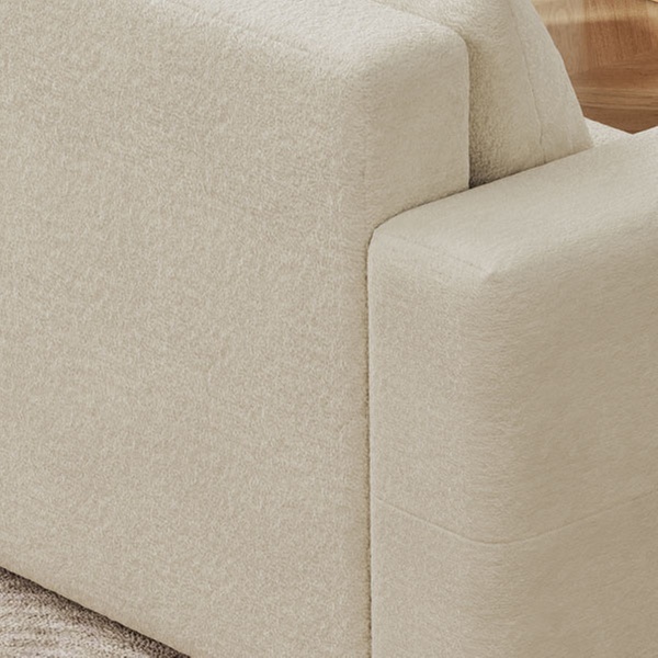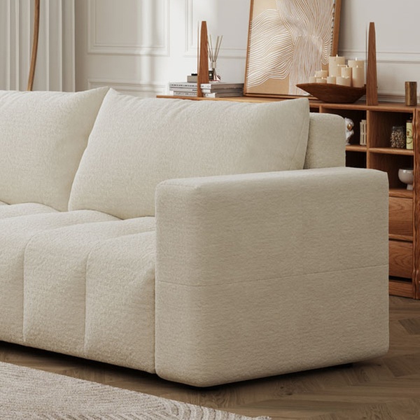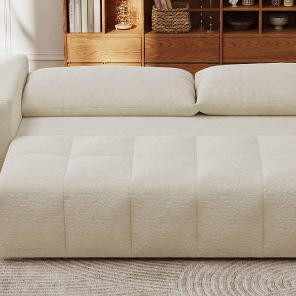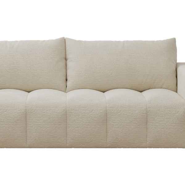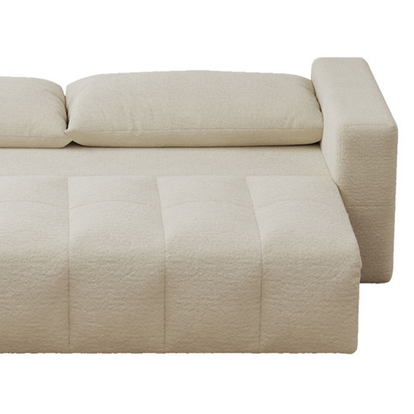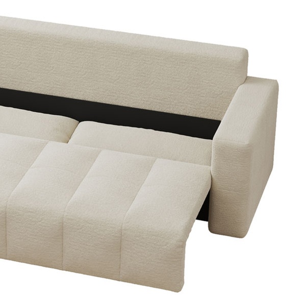 Alliez le charme du tissu bouclette tendance à la praticité d'un mobilier intelligent. Ce canapé droit transforme votre salon en un cocon de douceur tout en offrant un couchage d'appoint et un espace de rangement caché.