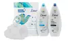 Ce pack Dove comprends un gel douche, un exfoliant et une houppette de douche conçus pour aider à rendre la peau plus douce et plus lisse