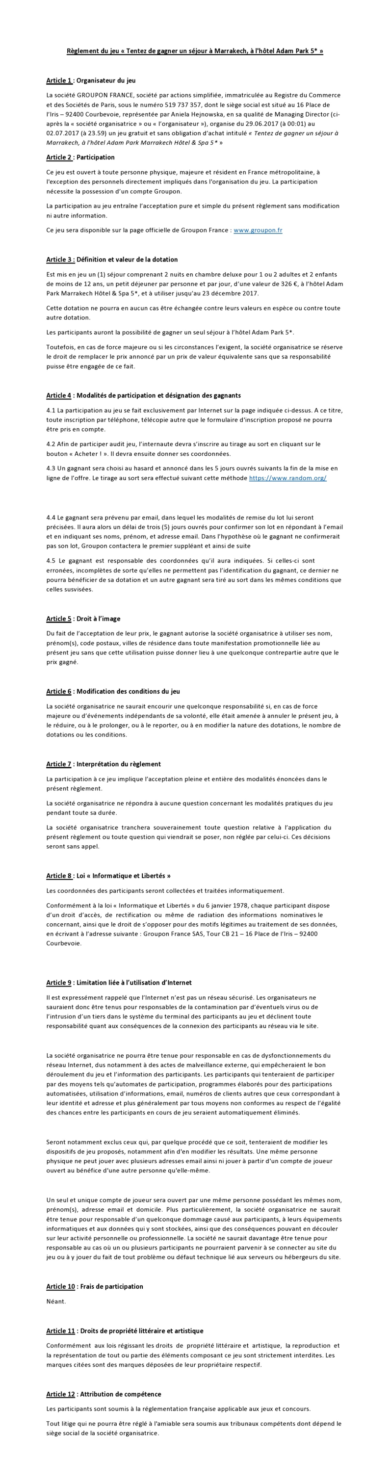 Le tirage au sort aura lieu dans les 5 jours ouvrés après la clôture du deal à compter du 02 juillet 2017. Le gagnant sera averti par e-mail dans les 5 jours ouvrés après le tirage au sort. Si le gagnant ne s'est pas manifesté au plus tard 7 jours après l'annonce de son gain, Groupon se réserve le droit d'effectuer un nouveau tirage au sort.