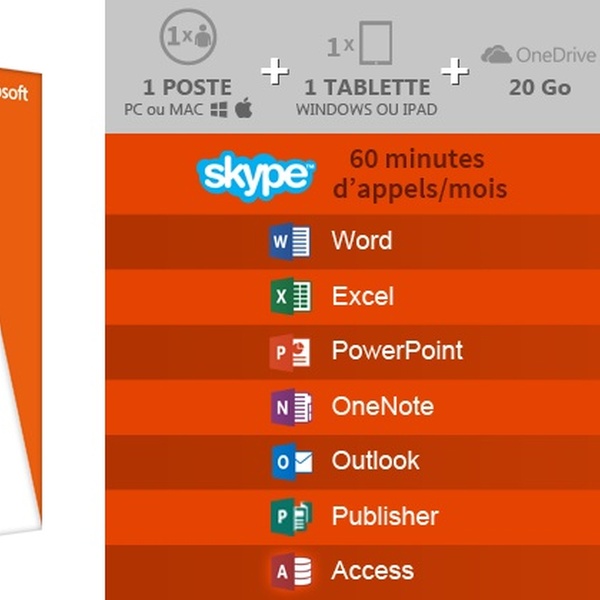 - Abonnement d’1 an incluant Word, Excel, PowerPoint et Outlook, le service de stockage OneDrive et les appels par Skype vers les téléphones du monde entier