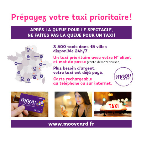 Valable dans les 15 plus grandes villes de France, mais aussi à Bruxelles ou Genève, la carte prépayée Moov'Card permet de réserver un taxi, une moto ou une voiture avec chauffeur prioritaire sans avoir besoin d’argent liquide sur soi. Moov'Card a signé des partenariats avec les principales radio-taxis dans chaque ville : près de 3 500 taxis, 200 motos et 150 voitures avec chauffeurs sont partenaires de la carte Moov'Card pour assurer un service de réservation 24 h/24 et 7 j/7.
