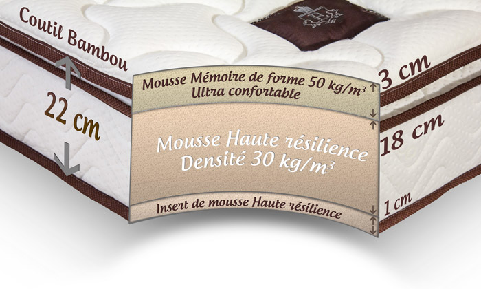 Le matelas Empereur à mémoire de forme est doté d’un sur-matelas intégré conçu pour apporter plus de confort. Sa mousse haute résilience vise à donner la fermeté nécessaire pour passer des nuits reposantes.