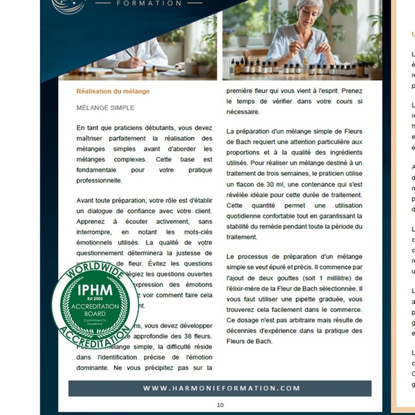À l’issue du parcours, vous obtenez votre certification IPHM (International Practitioners of Holistic Medicine), reconnue internationalement, attestant de vos compétences en accompagnement émotionnel par les Fleurs de Bach.