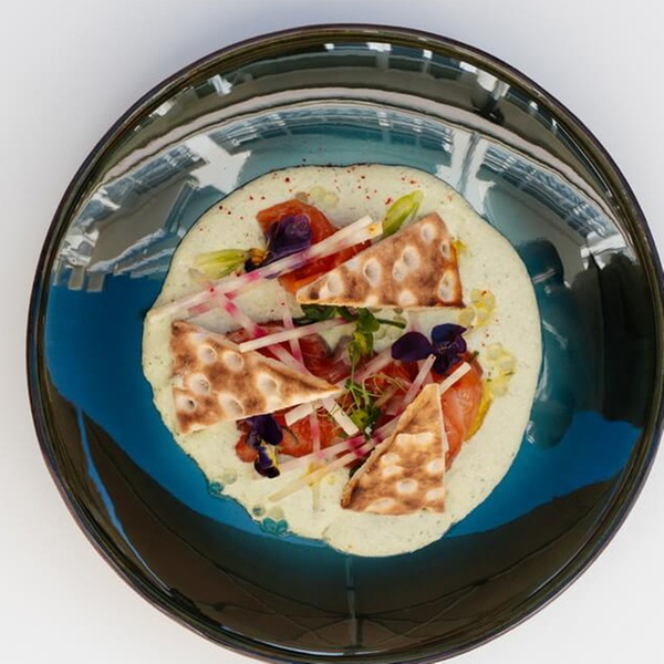 Fleur de saumon fumé et sa salade d’orge perlé, brunoise de légumes, vinaigrette passion