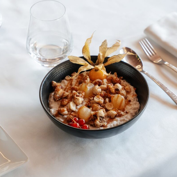 Velouté de patates douces, brisures de marrons rôtis et noisettes torréfiées