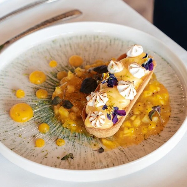 Pavlova exotique, brunoise de mangue, fruit de la passion en deux façons