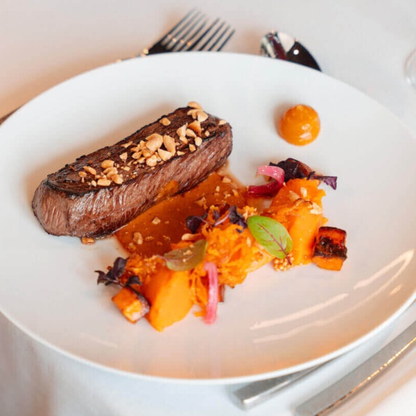 Pavé de faux-filet normand, gnocchis de courge et jus de viande caramélisé à la clémentine