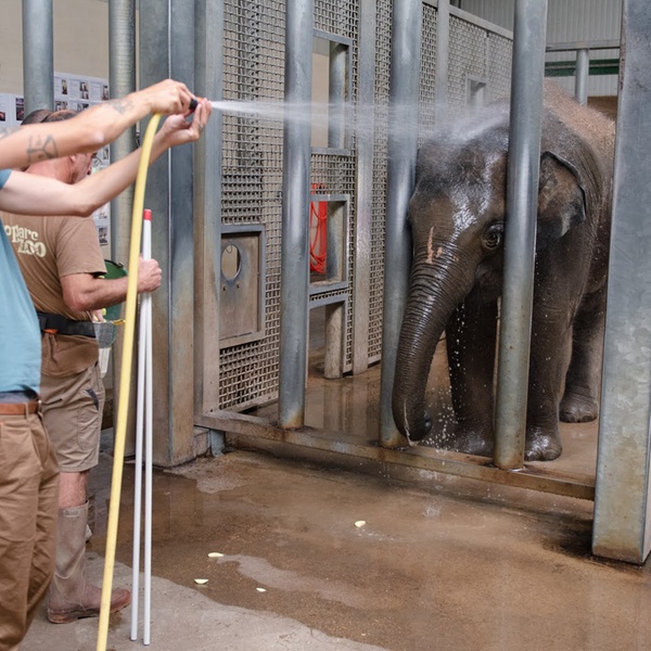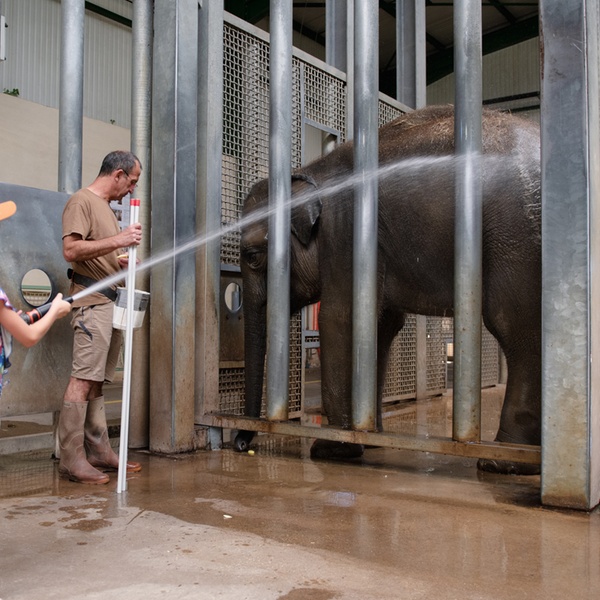 Participez à ce moment de détente quotidien : la douche des éléphants. Assistez les soigneurs animaliers lors de ce soin si apprécié de ces pachydermes.