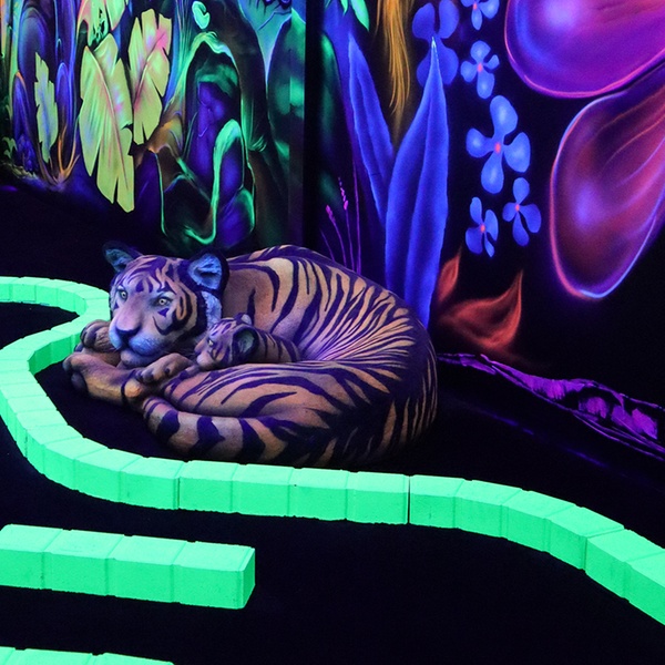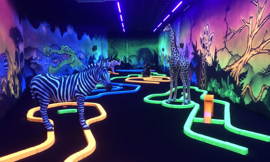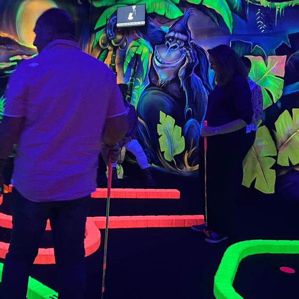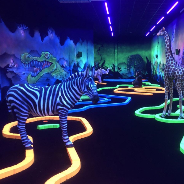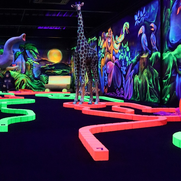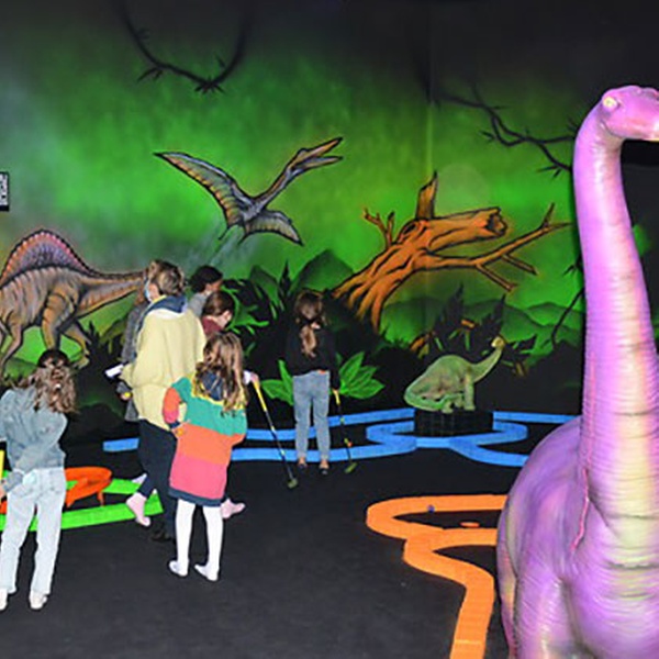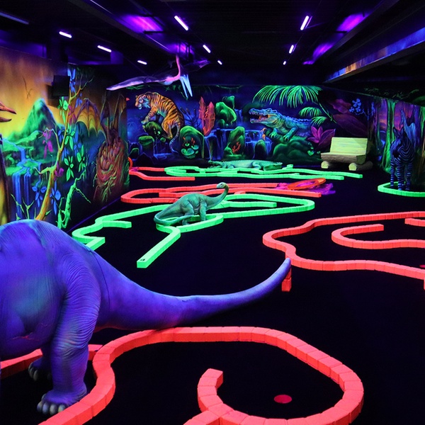 Goolfy à Anse : 60 minutes de mini-golf indoor fluo dans mondes Dinosaures, Jungle, Pirates. Fun familial immersif dès 3 ans, avec ou sans repas gourmand !