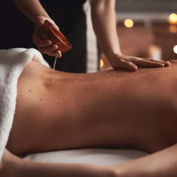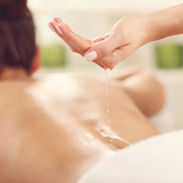 Utilisation d’huiles parfumées pour renforcer la dimension sensorielle du soin.