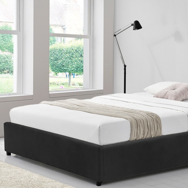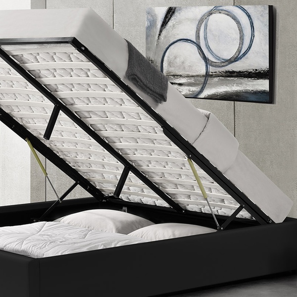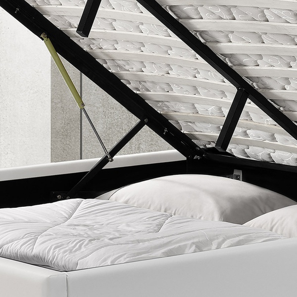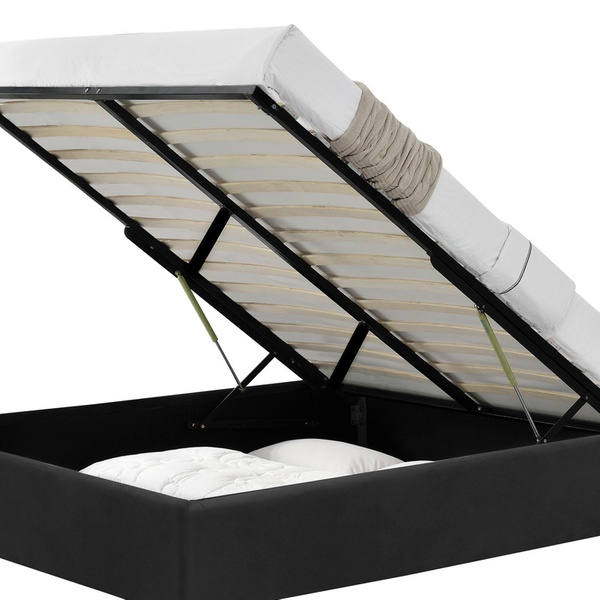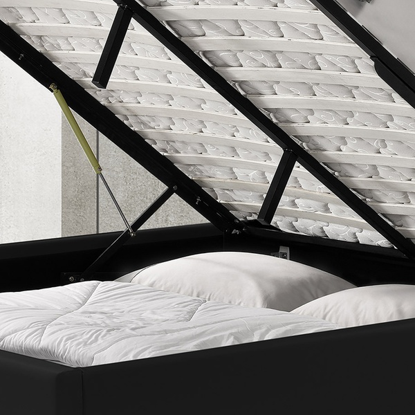 Ce lit élégant s'ouvre sur un vaste coffre de rangement, idéal pour optimiser l'espace tout en ajoutant du style à la chambre.