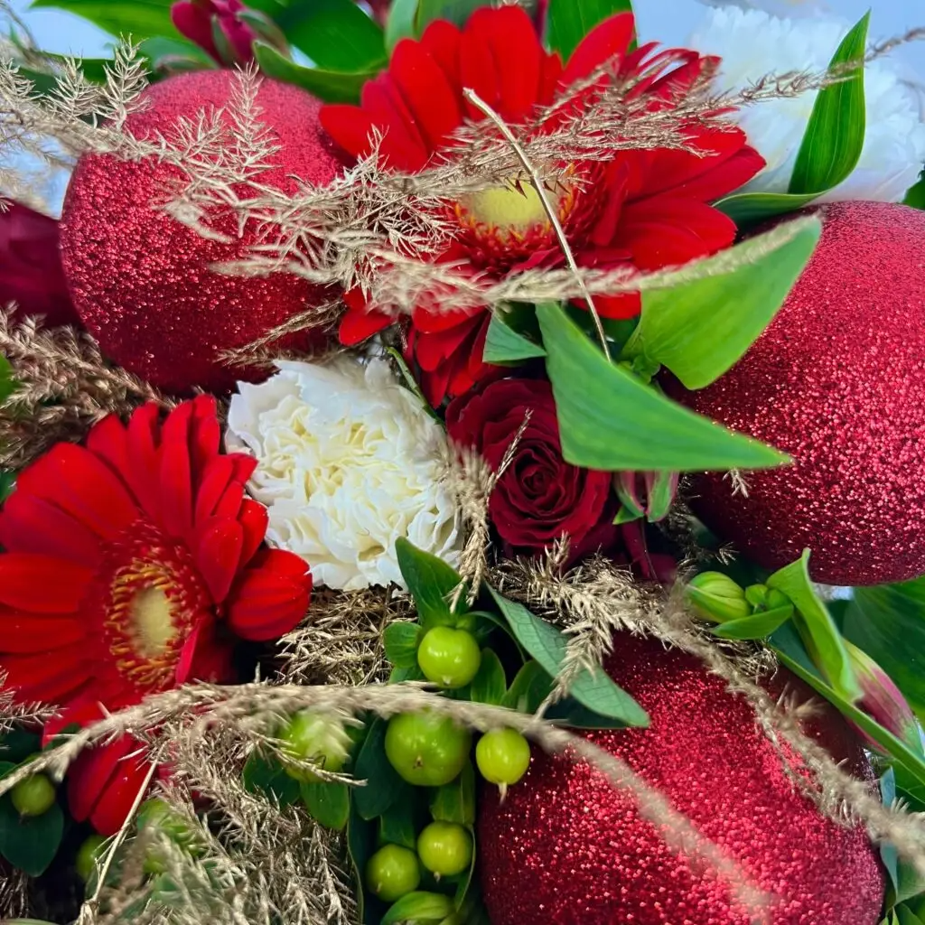 Découvrez un magnifique bouquet créé avec passion par nos artisans fleuristes, parfait pour éblouir vos proches et ajouter une touche festive à votre décoration de Noël ou du Nouvel An. Ses couleurs rouges et vertes apportent chaleur et chic à votre intérieur.