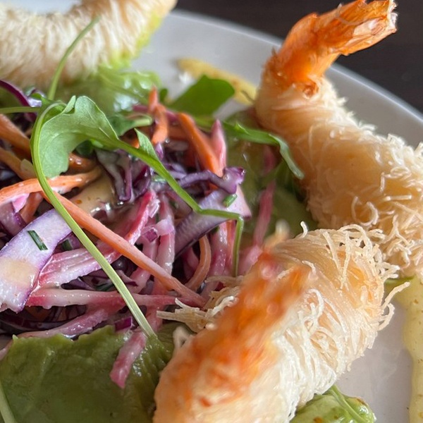 Crevettes croustillantes en kadaïf, avocat et coleslaw