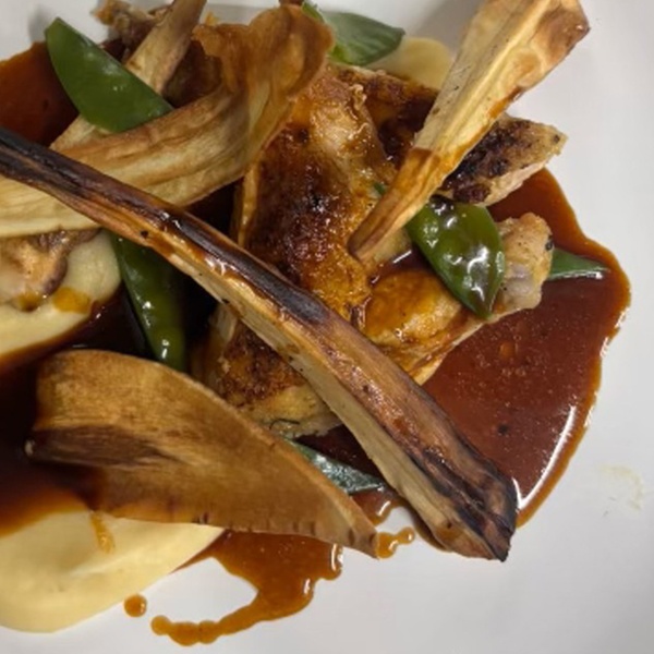 Suprême de volaille, déclinaison de panais, pois gourmands, jus corsé