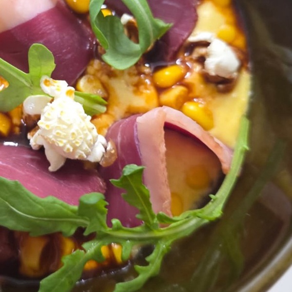 Crémeux de maïs, pop-corn, lamelle de magret de canard fumé, jus de viande