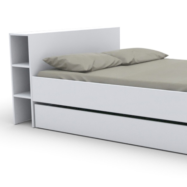 Tête de lit multifonction pouvant servir de bibliothèque ou d'étagères ouvertes pour y déposer livres, réveils, ou objets de décoration