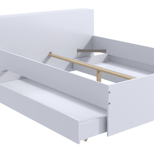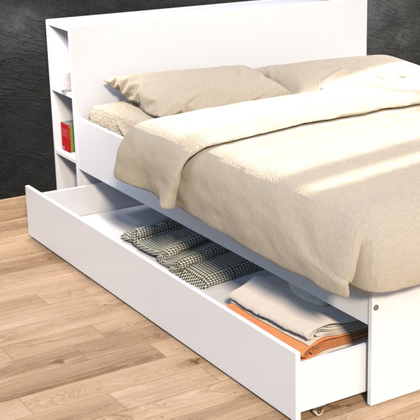 Équipé de deux grands tiroirs montés sur roulettes très utiles pour stocker linge de lit, vêtements, ou autres affaires
