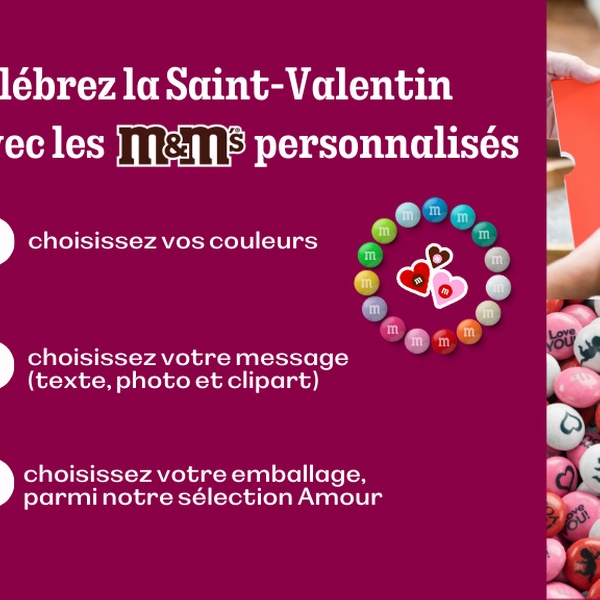 Ces bons d’achat donnent accès à l’ensemble de la gamme M&M’S® (hors produits d'entreprise et frais de transport). Ils permettent de concevoir des chocolats personnalisés avec des couleurs variées, des messages uniques ou même des photos, pour un rendu totalement original.