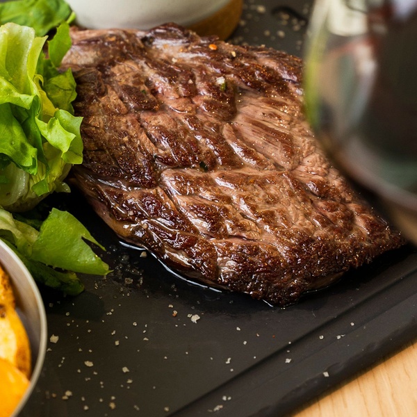Pièce du boucher (180 g à 230 g selon la pièce), pommes de terre grenailles et salade