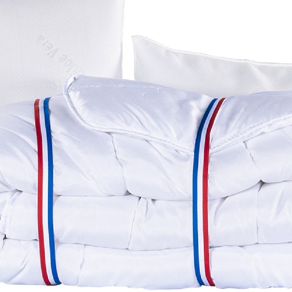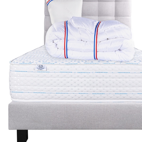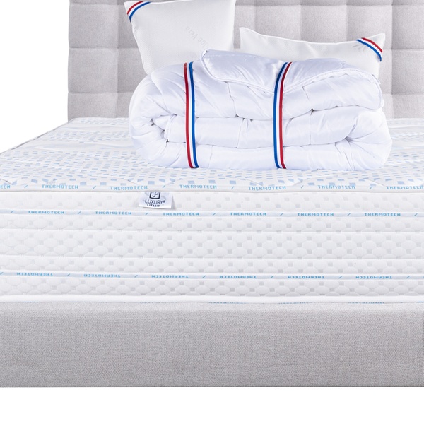 • Thermotec : matelas Thermotec 24 cm fermeté 8/10 face été/hiver + sommier gris 20 cm + tête de lit + 1 ou 2 oreillers + couette.