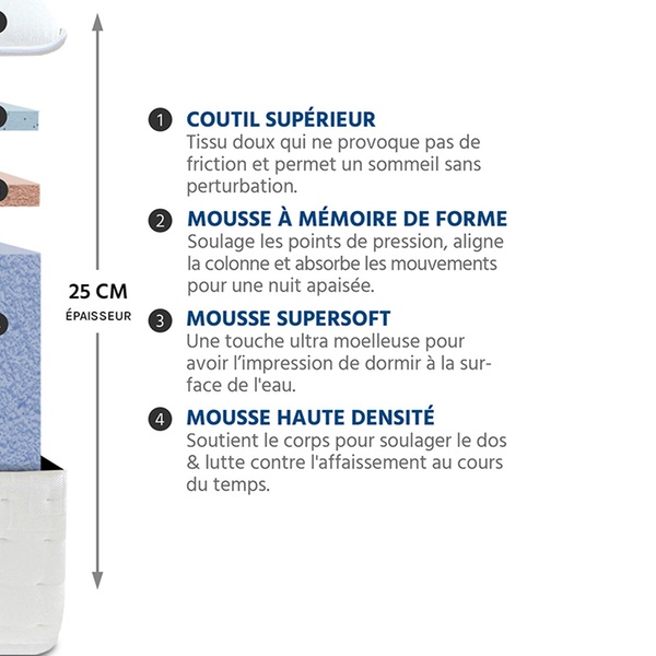 Avec une épaisseur de 25 cm et une combinaison de mousse à mémoire de forme et de mousse haute densité, ce matelas offre un soutien ferme et un confort progressif.