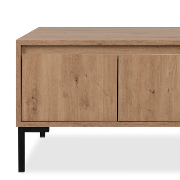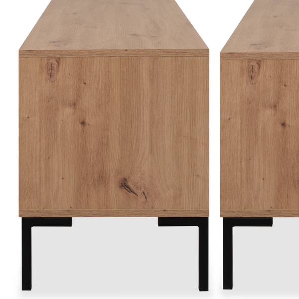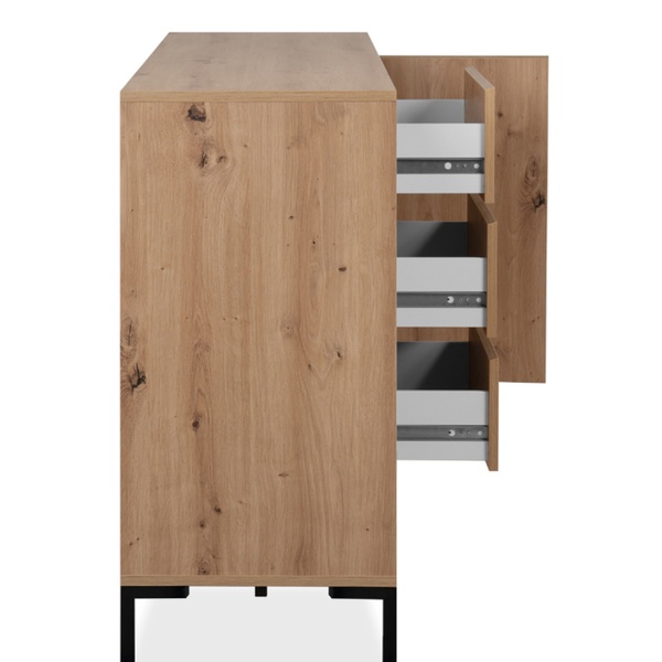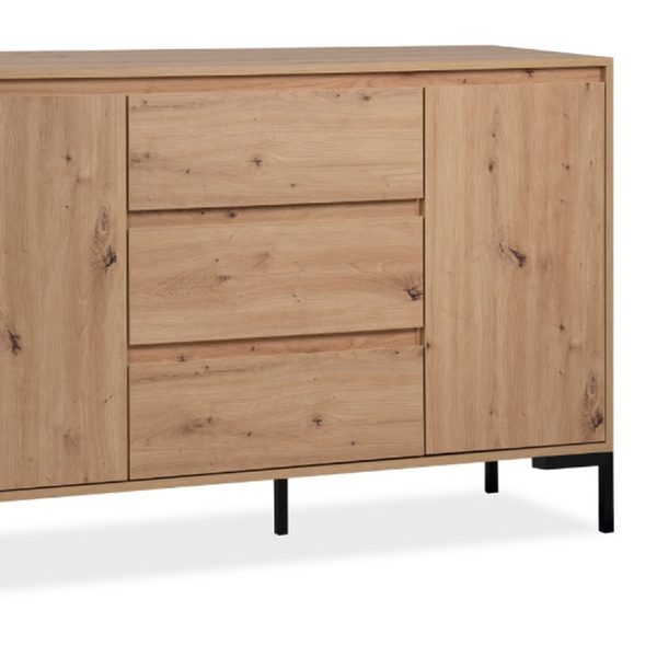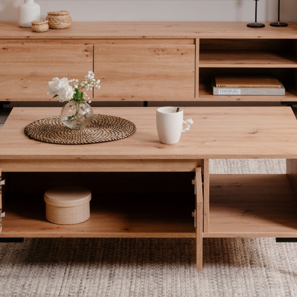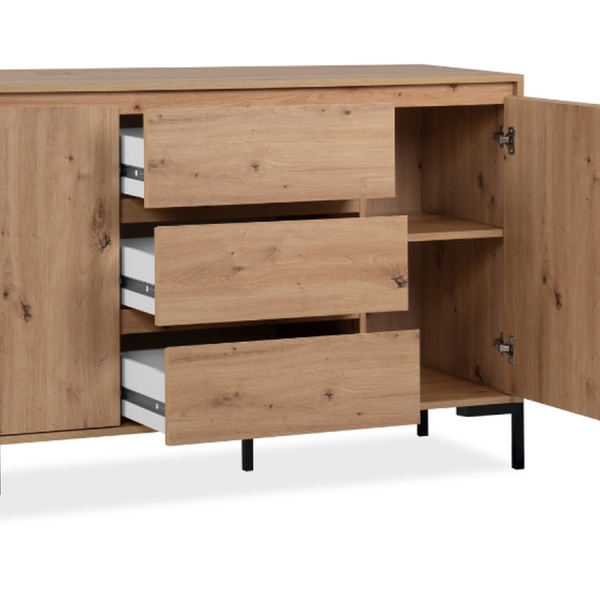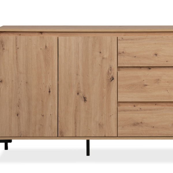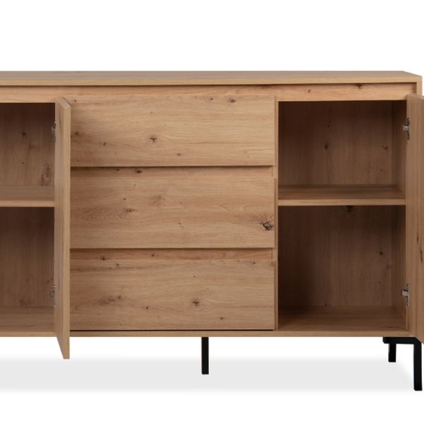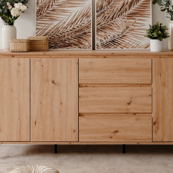 Optimisez l'organisation avec un buffet au large plateau et multiples rangements, alliant élégance en chêne artisanal et robustesse.