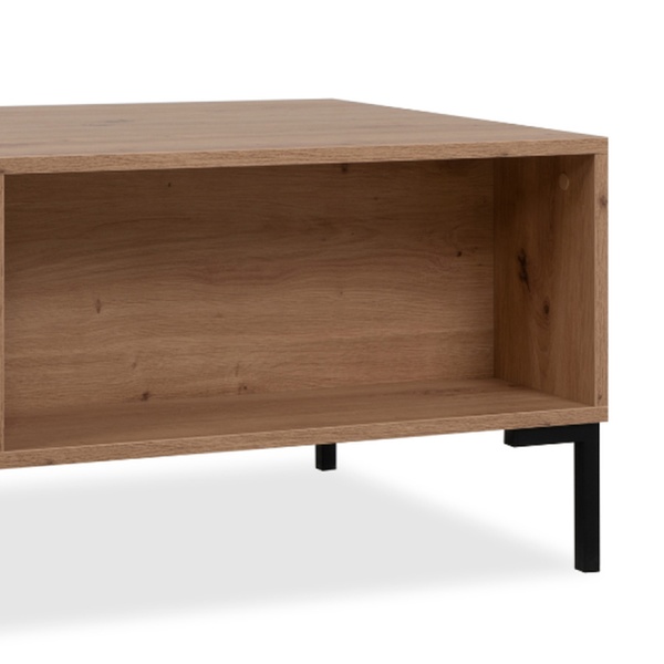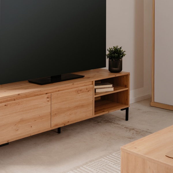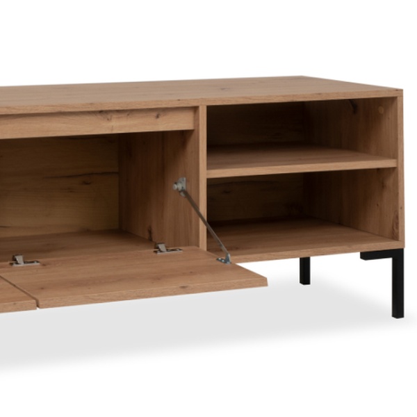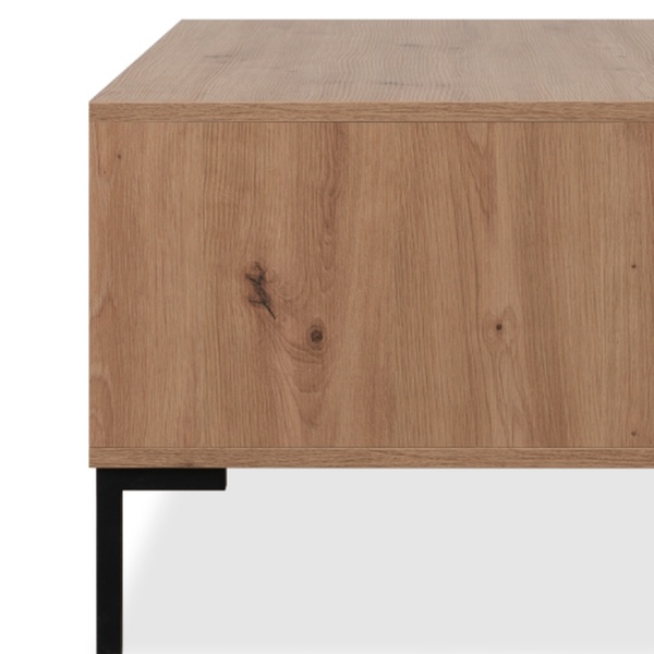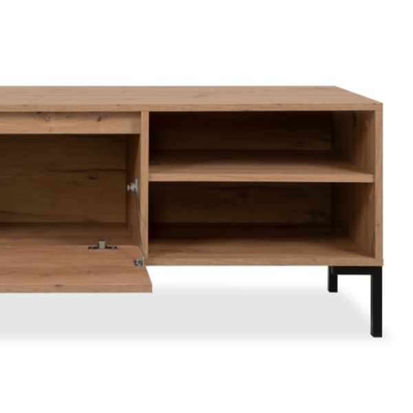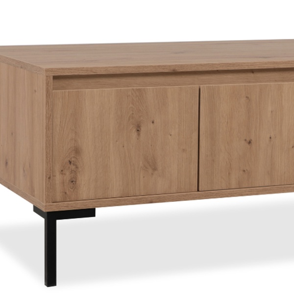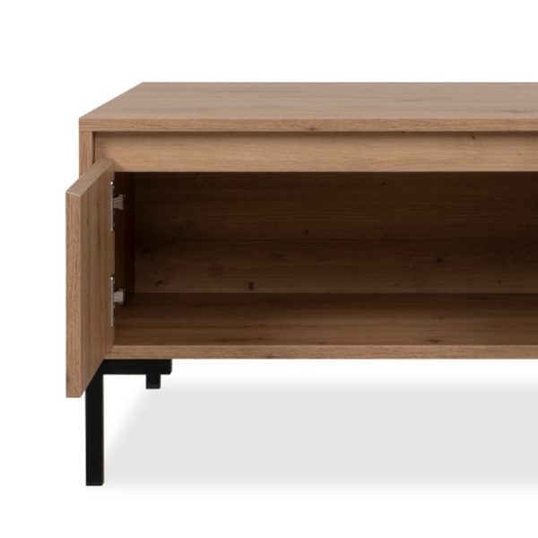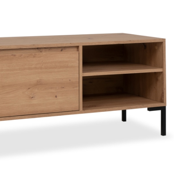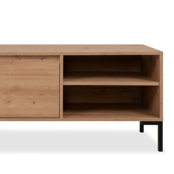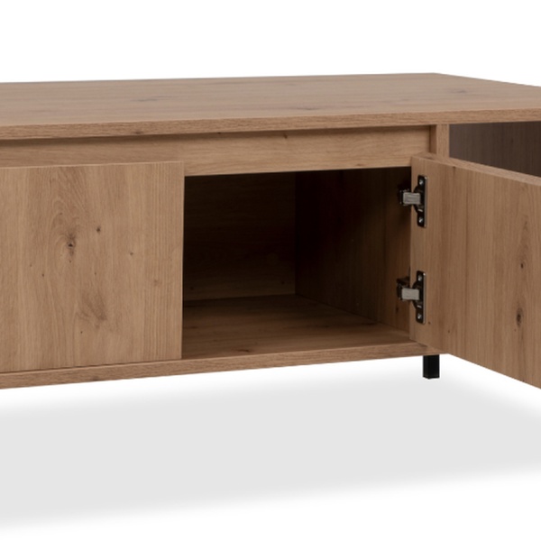 Optimisez l'organisation avec un buffet au large plateau et multiples rangements, alliant élégance en chêne artisanal et robustesse.