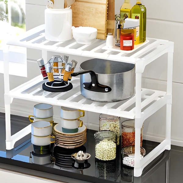 - Organisateur à 2 niveaux, idéal pour la cuisine, le bain ou tout autre espace domestique.