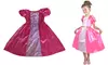 - Robe de princesse en satin rose avec pan central en satin imprimé, agrémenté d’une fine ceinture dorée et d’un papillon