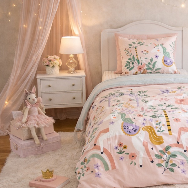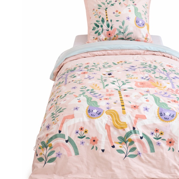 Cette parure de lit réversible en coton doux invite à la rêverie avec son motif licorne d'un côté et son design aventureux de l'autre.