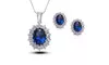 - Le pendentif et les boucles d’oreilles assortis présentent une pierre précieuse bleue royale entourée de cristaux clairs.