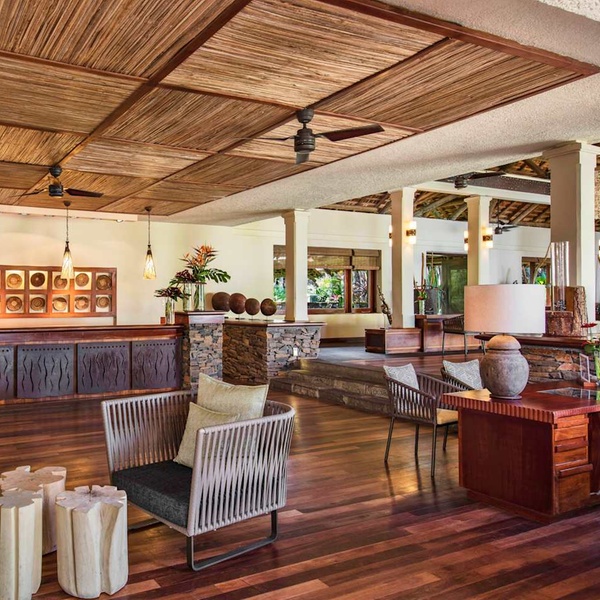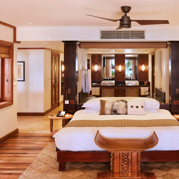 Cette spacieuse chambre bénéficie de la vue sur le lagon. Vous y apprécierez l'aménagement sobre, élégant et les références à l'Afrique.