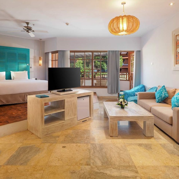Spacieuses et élégantes, les suites junior constituent l'option idéale pour une escapade en couple ou un séjour en famille. Résolument douillets, ces charmants logements conjuguent artisanat balinais et confort moderne. À l'extérieur, un balcon meublé vous permet de profiter de la douceur du climat en toute intimité.