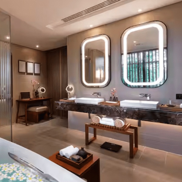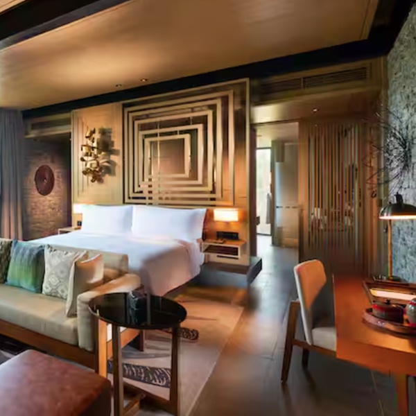 La King Deluxe Room est une chambre élégante avec un grand lit king-size, un balcon meublé avec baignoire à jets extérieure. Équipée avec un mini-réfrigérateur, une télévision HD 55 pouces, une machine à café Nespresso, baignoire et douche séparées, coffre-fort, et Wi-Fi. Profitez du confort de luxe avec canapé, peignoirs, chaussons, et un jacuzzi privé sur le balcon.