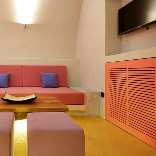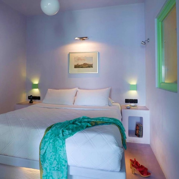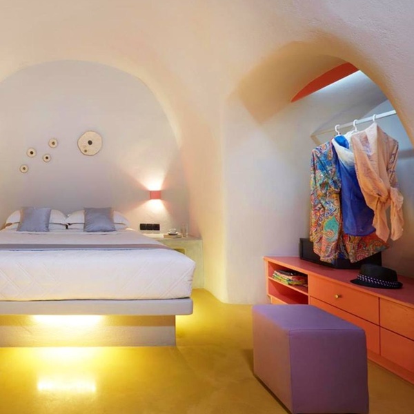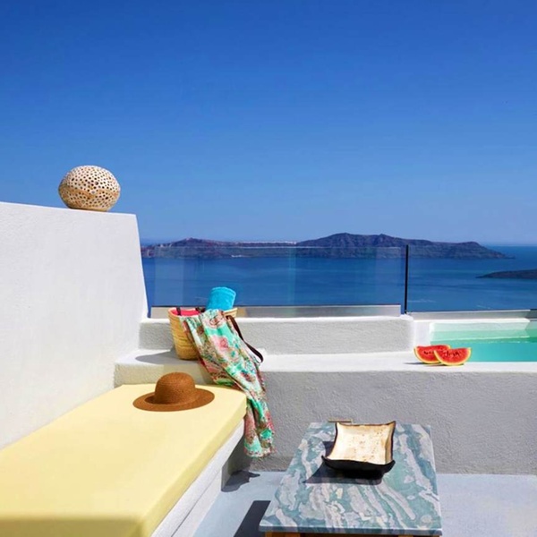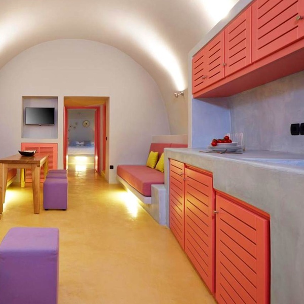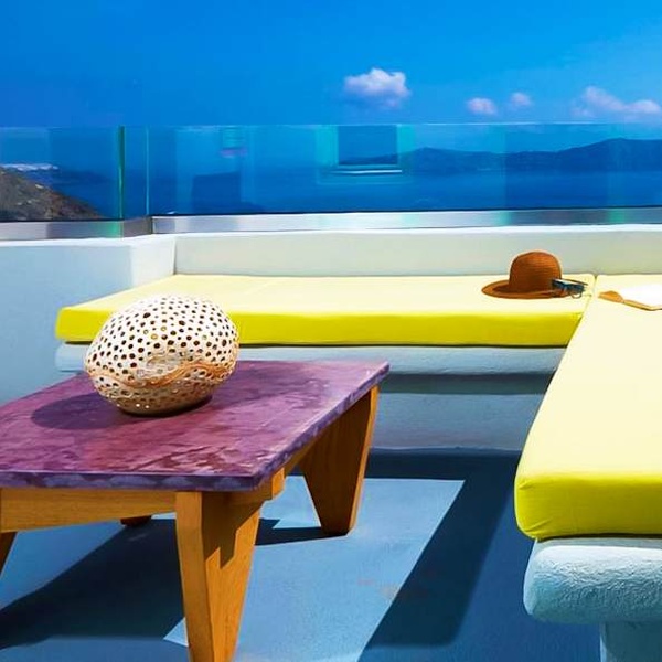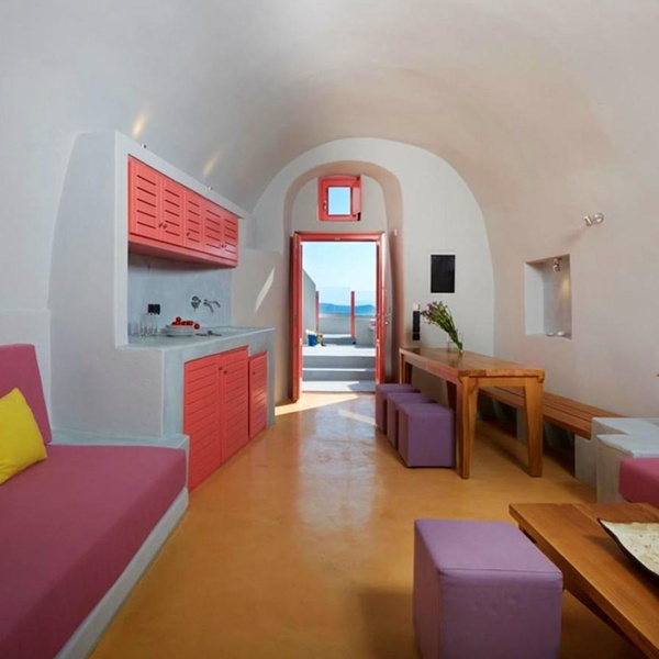 Jusqu'à trois personnes peuvent se détendre au sein de cette suite de 50 m². La chambre abrite un confortable lit king size tandis que le salon dispose d'un canapé-lit. La terrasse est agrémentée d'un jacuzzi où il fait bon se prélasser sous le soleil de Santorin.