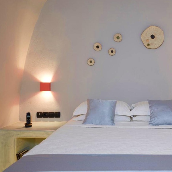 Imaginée pour accueillir un couple, cette chambre de 20 m² dispose d'un confortable lit queen size. Sa baignoire orientée vers la caldeira permet d'apprécier le paysage qui fait la renommée de l'île. Les couleurs claires employées dans la décoration sont associées à une lumière tamisée pour créer un espace romantique.