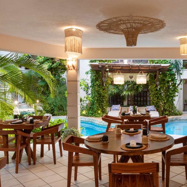 Céréales, fruits frais, jus pressés, gaufres et autres gourmandises sont servis chaque matin dans la salle à manger de l'hôtel. Vous aurez ainsi l'occasion de commencer au mieux la journée, avec une vue sur la piscine et les jardins luxuriants.