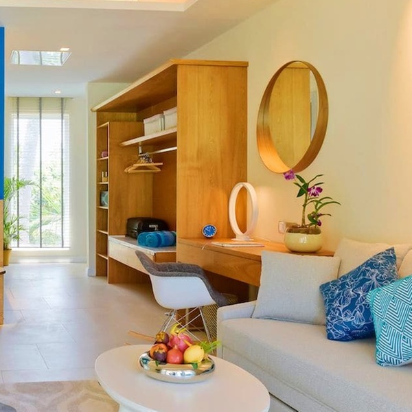 Blotties à l’ombre des palmiers au rez-de-chaussée d’une villa de deux niveaux, les Studios plage se dotent d’une terrasse privée de 15 m² accédant directement à la lagune. Adaptés au séjour des couples, ces écrins idylliques équipés d’un lit king size peuvent accueillir un invité supplémentaire grâce au canapé convertible.