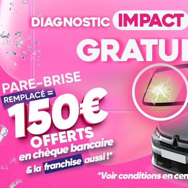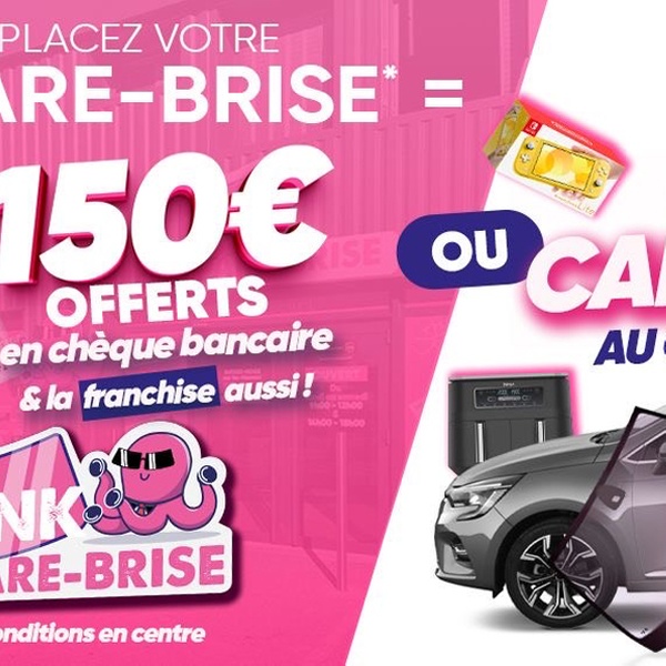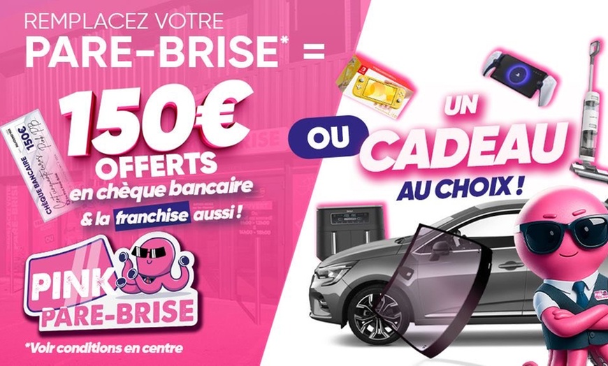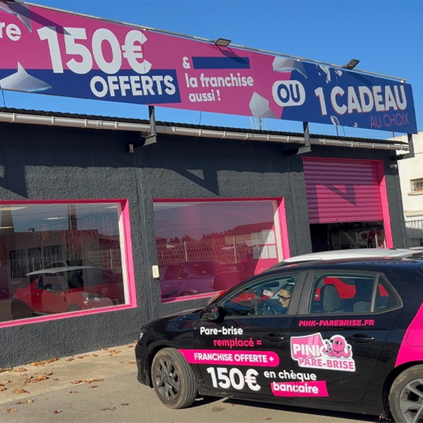 Offre double : remplacement de pare-brise ou diagnostic complet, avec jusqu’à 150 € de cadeaux et franchise offerte chez Pink Pare-Brise.