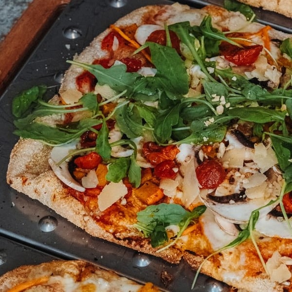 Pinsa Silva - tomates cerises séchées, champignons frais, potimarron local rôti, roquette, noisettes torréfiées, copeaux de Parmesan DOP