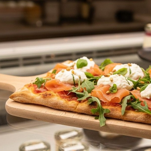 Saumon fumé (sauce tomate, mozzarella fior di latte, basilic frais, saumon fumé, roquette, stracciatella)