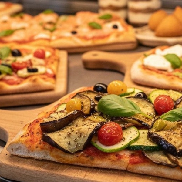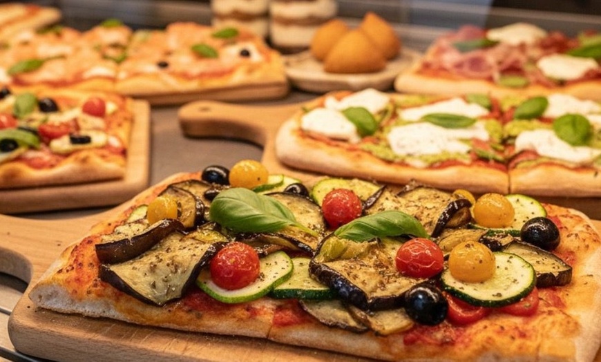 Profitez d'une immersion dans la gastronomie italienne avec une part de pizza généreuse préparée quotidiennement, à compléter selon vos envies par une touche sucrée.