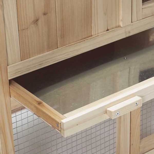 Fabriqué à partir de matériaux de qualité et grâce à son toit bitumé waterproof, ce clapier permet aux animaux de rester bien à l’abris des intempéries. Deux rampes (une de chaque côté) donnent accès à un espace surélevée chaleureux et isolé. Les poules ou animaux pourront donc se reposer tranquillement dans cet espace conçu spécialement pour leur confort. La porte grillagée permet un accès facile : hyper pratique pour aller récupérer les œufs tout frais pour le petit déjeuner! Ce poulailler est également équipé d’un tiroir à déjection amovible qui facilitera fortement le nettoyage. Enfin, les 3 portes du bas permettront aux animaux de rentrer et sortir facilement de leur cage !