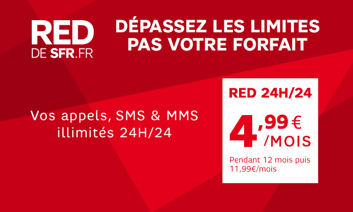 Forfait RED 24H/24 à 4,99€/mois pendant les 12 premiers mois (1), puis à 11,99€/mois, hors options. Offre sans engagement.