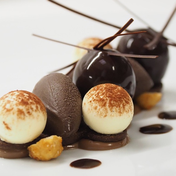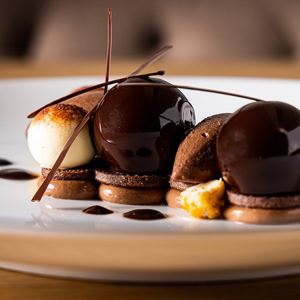 La banane : flambée et rafraîchit au citron vert, mousse au chocolat pure origine Madagascar, sablé cacao et fleur de sel, sauce whisky